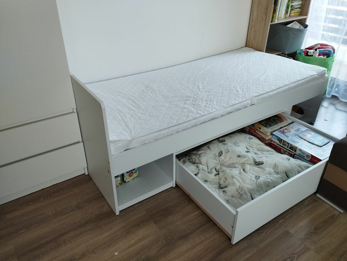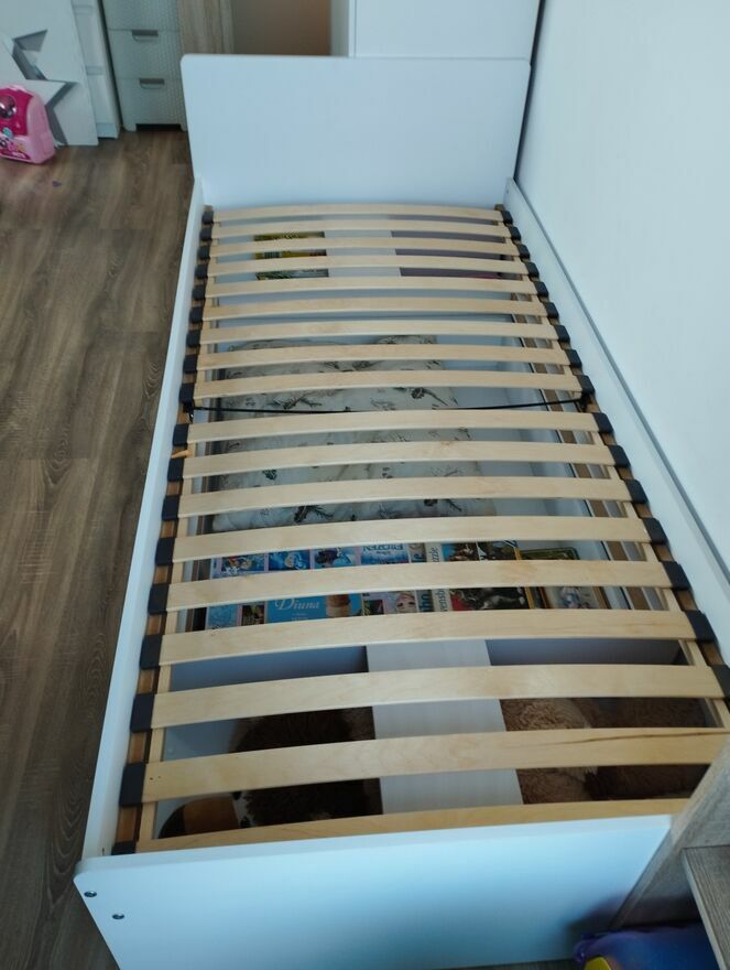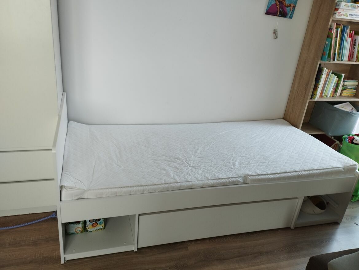 Łóżko białe 90 x 200 z materacem. Szuflada i dwie półki. Odbiór osobisty. Wysokość łóżka 43 i oparcia 75cmSzuflada 112 x 86 x 27